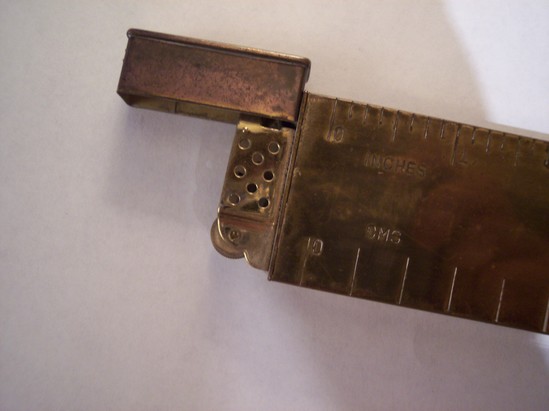 12" brass ruler, cap at left end which opens to reveal a lighter. Ruler face has inches across top and centimeters along bottom.