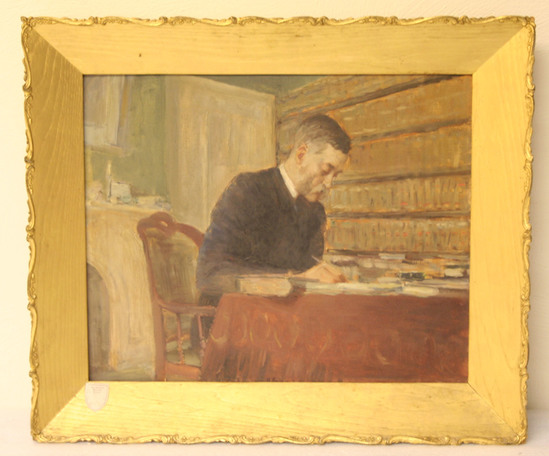 Oil on canvas portrait of Judge Edward W. Seymour, (1832-1892), an elderly man seated at a table, facing completely to the right, wearing a black judge's robe with white collar. Seated in armchair with black leather upholstery, at table with red cloth. Pen in right hand using it on a stack of paper in front of him. Wall bookcase in background to right and fireplace mantle to the left.