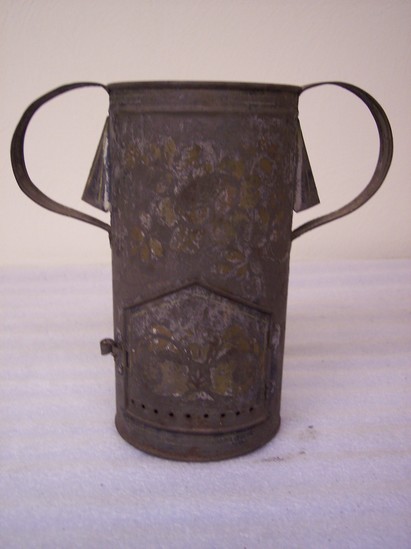Tin heater. Two applied ear handles, 2 triangle-shielded air vents under handles. Door in bottom has fine piercing; hasp handle. No other parts. Traces of gold leaf stencil on body.
