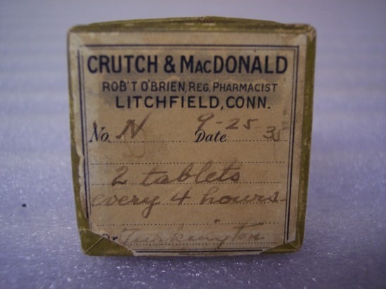 Empty square white cardboard box with green trim, label of "Crutch & MacDonald/Rob't O'Brien, Reg. Pharmacist/Litchfield, Conn" Prescription portion filled out for "No. N-- 9/25/35/2 Tablets every 4 hours/Dr. Turkington" Type label on bottom reads "Gift of Mrs. D. Ulrich 11/30/77"