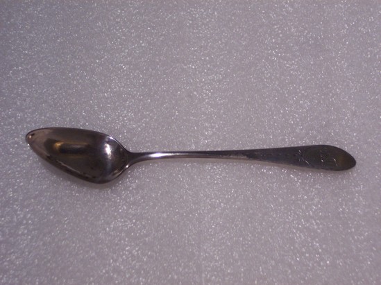 Pointed ovoid bowl, semi-circular cross section that widens into handle with down turning point. Bowl attached with flattened drop. Pattern on handle, forms an oval in which is monogrammed "BMT" - pattern extends down handle towards bowl. Initials stand for Benjamin and Mary Tallmadge
