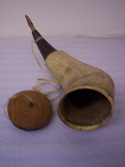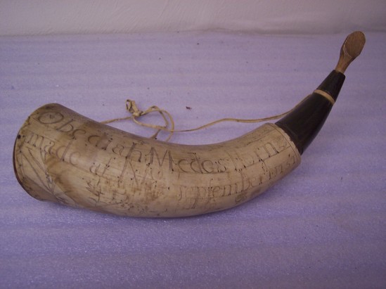 Leather strip runs from brass fixture in wood plug in large end to a groove in the narrow end. Wooden stopper for small end. Several drawings--animals climbing trees, horses, birdes on plants, flower-like designs, two coats of arms, man fishing in body of water with many fish. Inscription "Obediah Mede's Horn/made at (illegible) September 4th 1757"