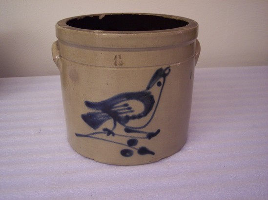 Stoneware crock, salt glazed with blue bird image on side of crock