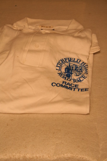 White short sleeved polo shirt with two buttons. Logo on upper left hand side of shirt, printed in blue. "Litchfield Hills Road Race" printed around outer edge of logo. "Race Committee" printed below logo.