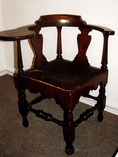 Reading arm corner chair. Front ball and ring turnings on stretcher; back has vase and ring turnings. Cabriole legs, front leg with rayed pad foot. Skirt with 2 reverse curves with half-moon in center on 2 sides front; 2 back sides plain. Vase-shaped splats. Used as "Judge's" chair in moot court sessions held in the Law School. and as Tapping Reeve's reading chair.
