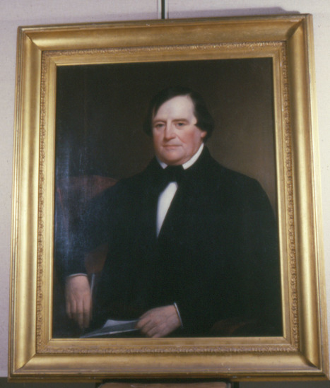 Oil on canvas portrait of Seth Preston Beers (1781-1863), Rectangular 1/2 length portrait of a portly middle aged man, seated, facing left. Black hair and hazel eyes, dressed in black suit, white shirt and collar, black bow tie. His right arm rests on a table holding a pamphlet and in his right hand a quill pen.