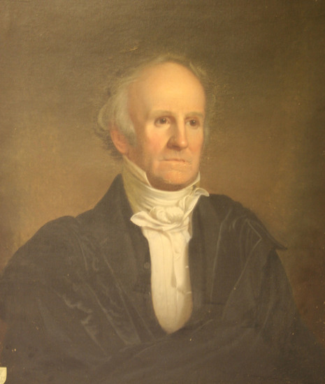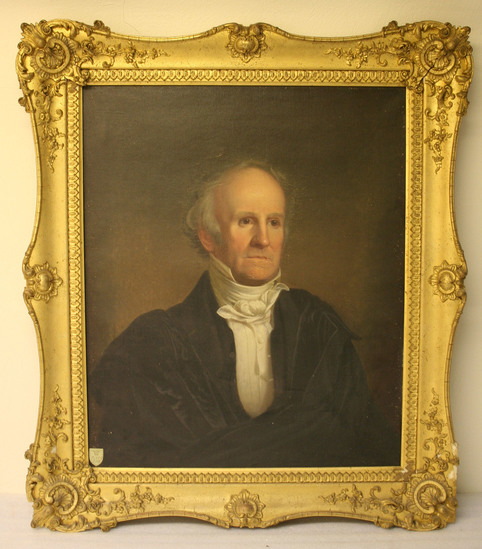 Oil on canvas, rectangular 1/4 length portrait of an elderly man facing to the right with gray hair and brown eyes, wearing a black clerical or academic robe, white high collar shirt with white stock.