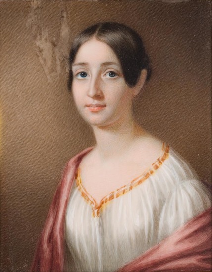 Subject is shown full face, slightly to left, with black hair parted in middle and dropped down sides and over ears. Blue eyes. She wears white off the shoulder dress and a red shawl. Subject is the granddaughter of Colonel Benjamin Tallmadge. Her bust is located in the museum.