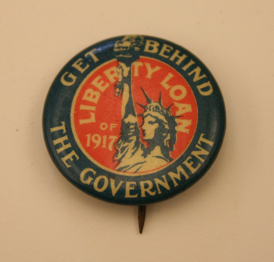 World War I era pin. Round metal button with stick pin on back. Blue border surrounding red center. White text in border, "GET BEHIND/THE GOVERNMENT." Blue and white image of the Statue of Liberty in center, with white text "LIBERTY LOAN/OF/1917."