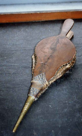 Handles and sides of one shaped piece of crotched mahogany held together by blue dyed leather, brass tackes slightly pointed, brass tacking patterns around spout, decorated brass spout. From the Farnham family in Morris, CT