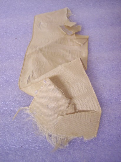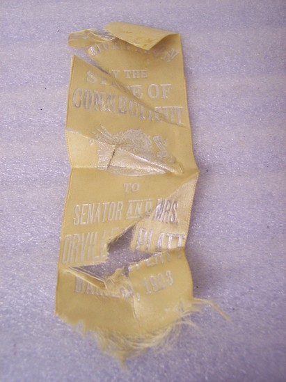 Cream colored rectangular shaped ribbon. Printed in silver lettering on ribbon "RECEPTION/BY THE/STATE OF/CONNECTICUT" in silver at this point on ribbon appear seal of Connecituct "TO/SENATOR AND MRS/ORVILLE PLATT/MARCH 20, 1903"