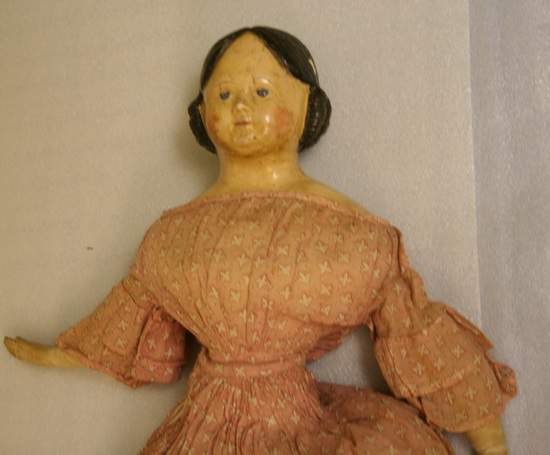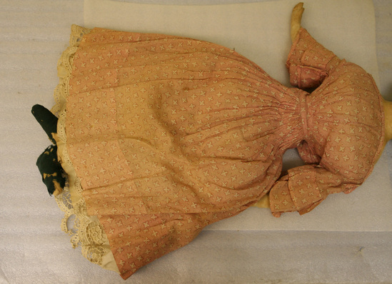 A - Large female doll with bisque ceramic head and shoulders. Face painted with blue eyes, red cheeks and lips, hair painted black. Body stuffed with linen form. Arms sewn on separately at shoulder with fingers created by sewn seam lines. Wide hips. Torso has wooden stays under linen to hold body upright. Bottom half of legs sewn on at knees. Long tubular shaped feet. B - Doll's dress - pink cotton, repeating print design in white and red, wide neckline, short ruffled sleeves, waistband, long skirt, pocket on one side, hook and eye at back C - Handkerchief - doll size, white cotton hemmed on all four sides, found inside pocket of 1913-24-0 B D - Drawers - white cotton, cutwork embroidery with scalloped edge at bottom of each leg, drawstring waist band, fabric slightly discolored, tear between legs. E - white cotton petticoat, drawstring waist, seam down back with small tear, discolored. F - Petticoat - white cotton, waistband with button on back, button hole torn, 3 pieces of fabric seamed together to make skirt, wide hem, dirty, holes throughout. G - Petticoat - polished linen, off white color, waistband, no closure, cutwork embroidery - repeating design of large round flower at bottom, scalloped edge, several large holes, dirty H - Pair of white cotton socks, discolored, one has several holes at top I - Pair of green felt shoes, silk ribbon ties, poor condition, torn, pieces of fabric missing