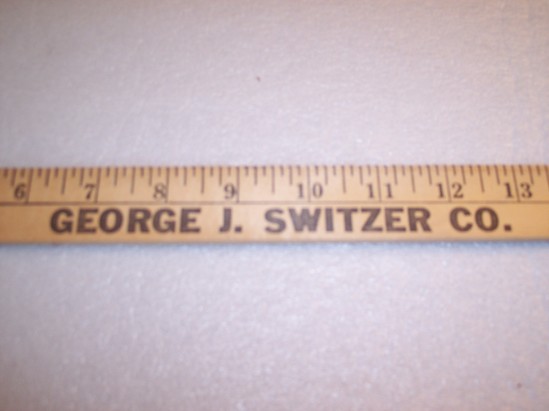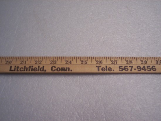 Wooden yard stick. Same design on both sides. Measurements in 1/8" increments starting at 1/8" to 36" run along top of yard stick. 1/8" are demarkated with a black line. Along bottom reads "George J. Switzer Co. Building Supplies Litchfield, Conn. Tele. 567-9456"
