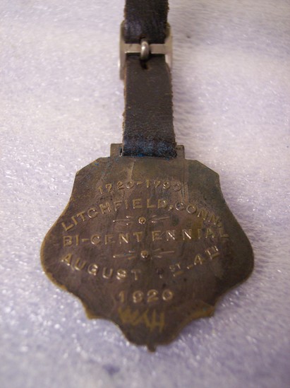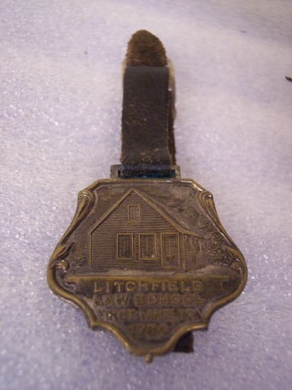 Leather strap with buckle. Attached to strap white metal medal in shield shape. On one side is image of law school with inscription "Litchfield/Law School/First in America/1784" On back side "1720-1920/Litchfield, Conn/Bi-centennial/August 1st - 4th/1920"