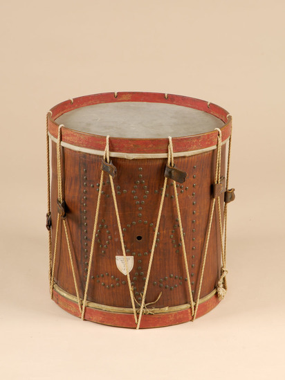 Wooden barrel with red painted rims, rope with leather ties through holes in rims. Design in brass rivets on body of drum. Small hole in side in of body show inside drum and paper labels. First is printed "Benjamin Brown Jr. Drum Manufacturer Has Constantly for Sale Brass and Snare Drums Made in Best Nearest Manner" Second is handwriteen "Drum heads by Gurdon Filley, Litchfield, CT"