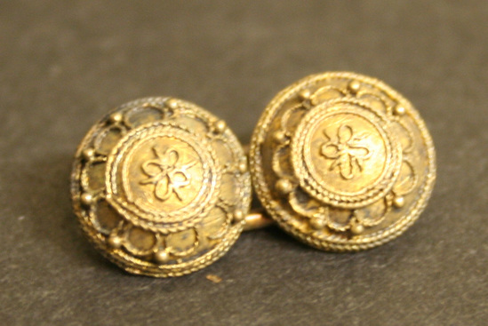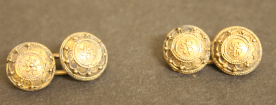 Pair of woman's cuff links. Two metal buttons with gold filagree on top fastened with single link.