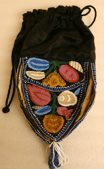 Purse is divided into two sections - the top half is composed of black silk. The top is gathered and there is a black silk drawstring through the top to close the purse and act as a handle. The bottom half of the purse is composed of a heavily beaded design. Large floral blooms in shades of pink, orange, cream and blue. The beads are done in four distinct panels creating pronounced sides to the body of the purse. There are gathered loops of beaded fringe at the bottom of the purse. Interior lined with orange silk.