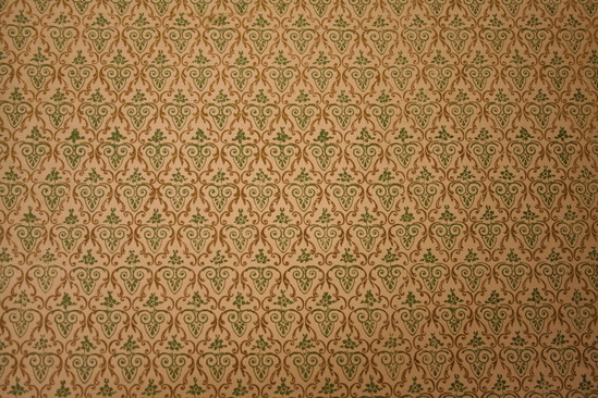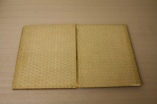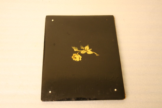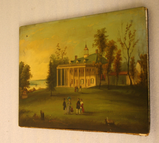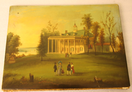 Portfolio - the front has a painted scene of Mount Vernon with people walking on the lawn. The back has a simple spray of moss rose in gold leaf. On the back in each corner are small mother of pearl buttons. These are missing from the front. The binding is tooled leather in gold and the inside is lined with a patterned paper of green and gold on a white ground.