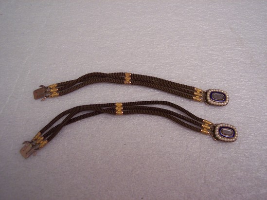 Pair of bracelets; each bracelet three strands of braided hair with gold collars attached to one side of oval centerpiece and with a slip lock inserted on other side. The oval is a gold setting with a row of seed pearls surrounding a band of blue enamel holding a glass under which is a braid of hair of deceased.