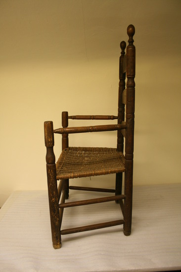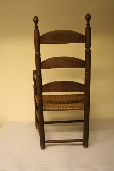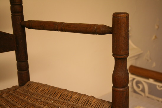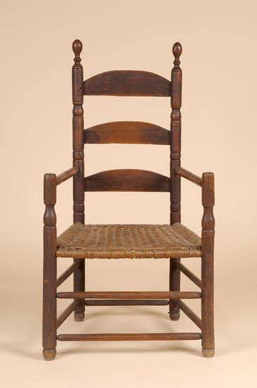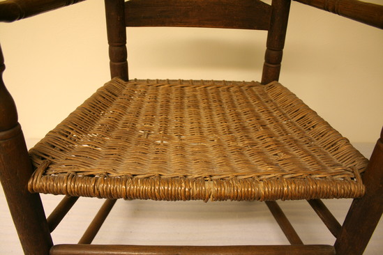 Ladder back arm chair with rush and cane seat - front of seat wrapped in rush with rest of seat caned; front legs have turnip feet, worn, round through seat then turned - groove, vase turning, groove, round with groove near flat top; double round stretchers; front and sides with single stretcher across back; back legs same through seat, the groove saussage turning, groove, arched slat repeat, vase turning, last splat, ring, groove and bulb finial; arm rest vase turned ends, rings, center ring with side grooves