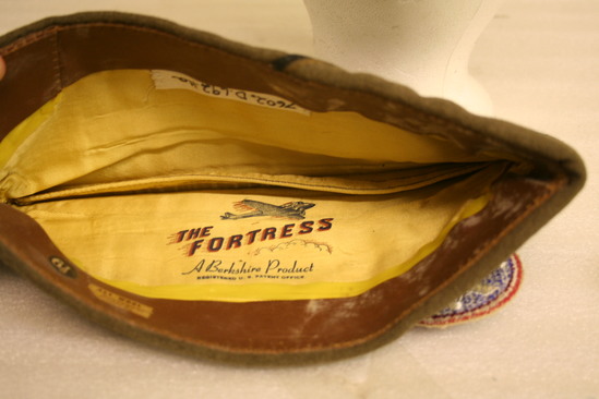 Gren wool cap; folded rectangle shape; edge of fold trimmed with black cord. Pinned on side, near front, is a round patch with blue background, red edge, and white plane and parachute embroidered design; on inside a brown leather band and yellow silk lining; label "The Fortress/A Berkshire Product/Registered U.S. Patent Office" with plane design