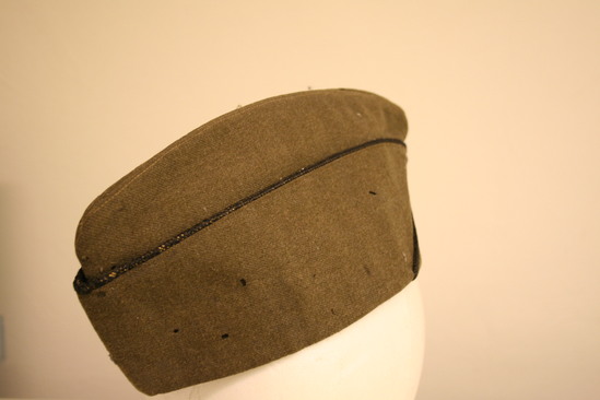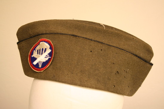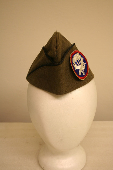 Worn by Edward A. Raymond while serving in U.S. Army during World War II. The pinned patch is an airborne division garrison cap insignia, issued to members of the parachute and glider (plane) infantry and artillery divisions. Gliders facing to the right indicated officers, and to the left indicated enlisted men. The donor was an officer at the time he was issued the patch.