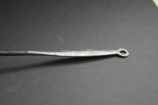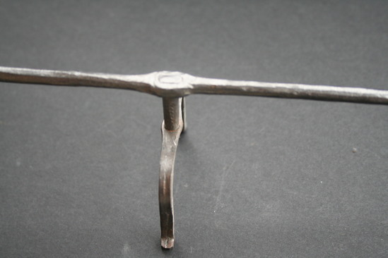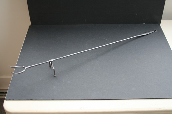 Long iron fork with hole for hanging at end of handle. Two prongs at end of fork. Two short legs near prongs of fork for resting it on the ground near the fire. Handle widens and flattens at end.