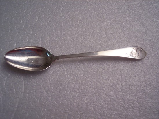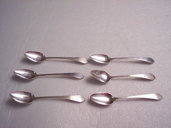 6 coffee spoons, silver, Kovel shape 1800. Engraved on each handle "AP" for Amelia Philips. Hallmarked on back of each handle "W/H"