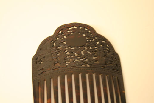 Tortoise shell woman's hair comb. 14 teeth - each approximately the same length. Chinoiserie scene on ridge, pierced design. Domestic and garden scene of four Chinese figures. Tondo for initials in center. Border of dots around pierced design.