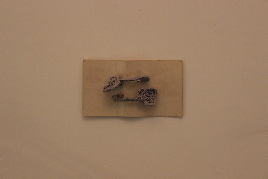 Two silver safety pins covered in grey crochet stitch with trefoils at the head of the pin and secured to ivory card stock.
