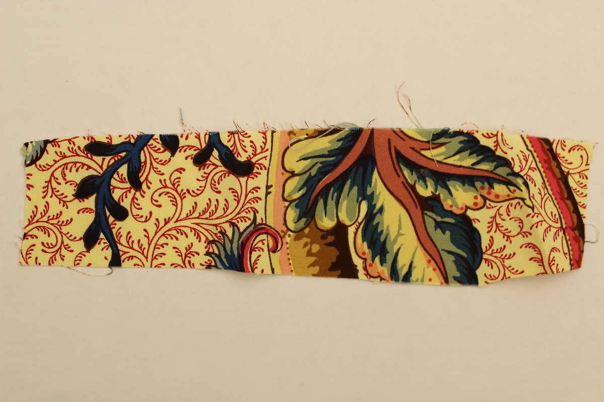 Rectangular fabric swatch made of synthetic material. White background with a swirled rose vine pattern over the vine. Pattern is a large pattern of blue and pink vines with green, blue and brown leaves. Fabric is stiff to the touch.