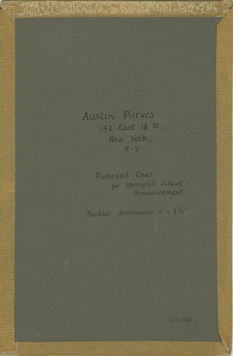 Ink drawing completed by Austin Purves (1900-1977) as a design for a Spring Hill School publication. Ink on white textured paperboard with dark gray reverse. Rectangular pencil border containing black in drawing of a house and landscape scene above a small water scene with three ducks. At center in black lettering, "The/SPRING HILL/School." Signed below in smaller black lettering, "A. Purves." Written in pencil below design, "Full size dimensions of Announcement/ 8 5/8" x 5"." Black lettering on reverse, "Austin Purves/142 East 18 St.,/New York/N.Y./Proposed Cover/for Springhill School/Announcement/Booklet dimensions 5" x 8 5/8"/ 3/23/35." Board edges bound with masking tape.