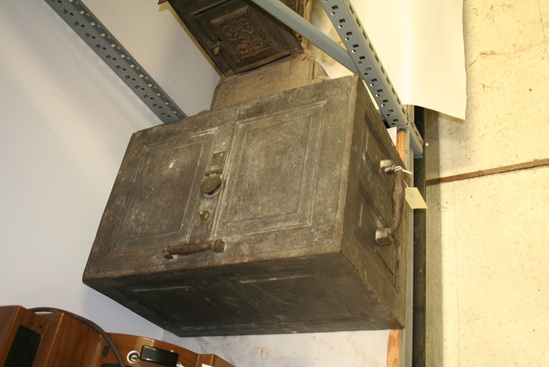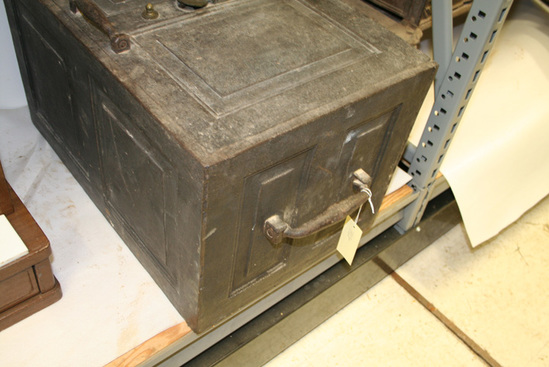 Rectangular hinged with strongbox with cast faux feather edge panels. Pivoting iron handle to lift lid. Brass knob releases spring released circular brass plate that is hinged and riveted to the iron door with rectangular plate. Front, rear, and sides all have faux panels and the sides have pivoting carrying handles. Sides dovetailed and forved together under heat to form permanent bond.