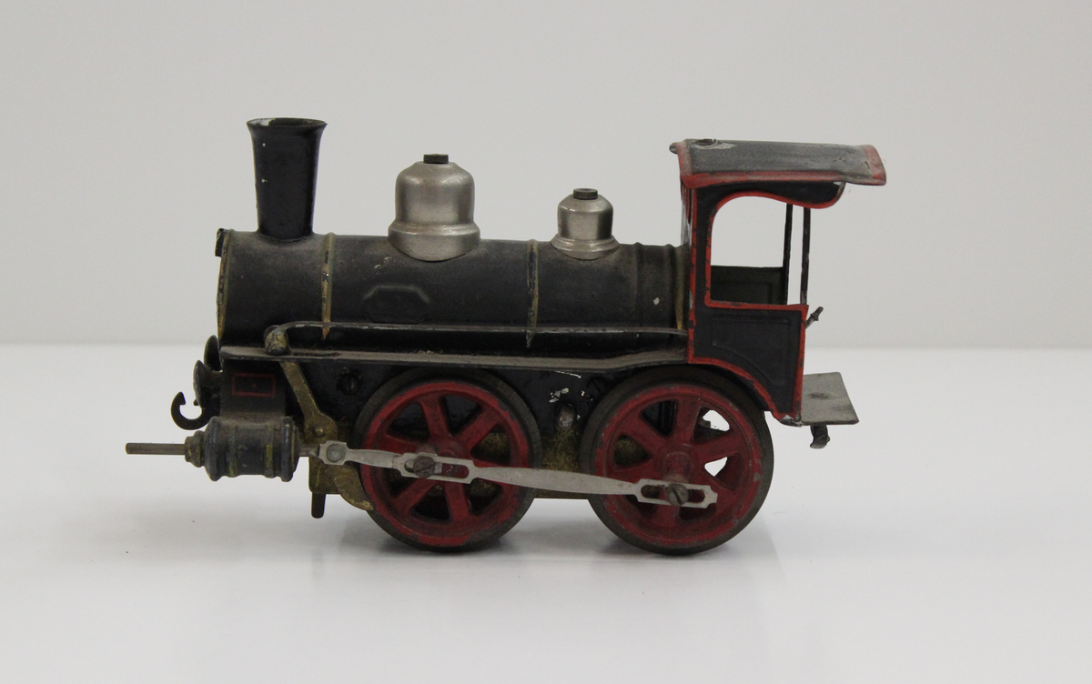 Early 20th-century clockwork locomotive made by Märklin. Black locomotive with four red wheels and red and gold detailing. The engine has a smoke stack, sand box, and steam box. The conductor's compartment is open and has one lever, although the end of the lever appears to be broken, as well as a hookup for train cars. Stamped with Märklin's "MC" shield logo on the front. Square clockwork gear extends from left. Engine also has a hookup and two buffers at the front.