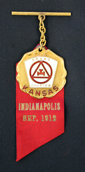 Gold Masonic medal. Thin oblong bar across top with a gold chain extending from the center. Red silk ribbon hanging from chain with "INDIANAPOLIS / SEP. 1912" stamped in gold. Round pendant hanging in front of ribbon. White and red enamel shield in center with Masonic symbol in center. "GRAND" in gold across top of shield. "CHAPTER" in gold across bottom of shield. "M.E." stamped on pendant above shield. "KANSAS" in red enamel across bottom of pendant. "ROBBINS CO / ATTLEBORO / MASS" stamped on back of pendant.