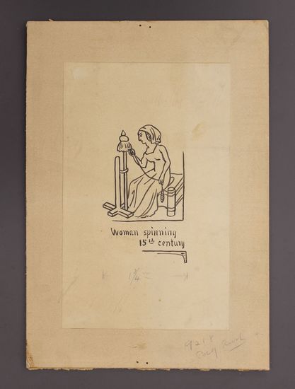 Illustration on paper executed in pencil and black paint. Illustration mounted on board. Artwork depicts a seated woman spinning with a drop spindle and distaff.