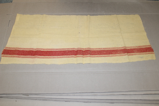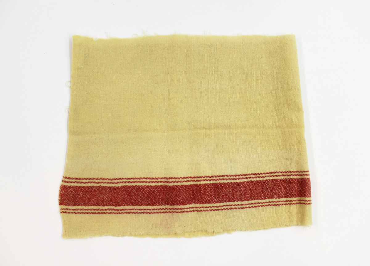 Remnant of cream colored wool with red striping on one side. Two thin lines, one thick line, and two thin lines. Two ends selvage edge, two other ends frayed.