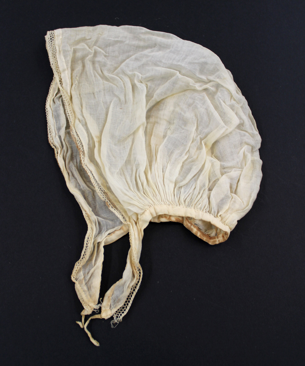 Off-white sheer cotton child's bonnet; embroidery at sides and back; lace at front; piping; fabric ties