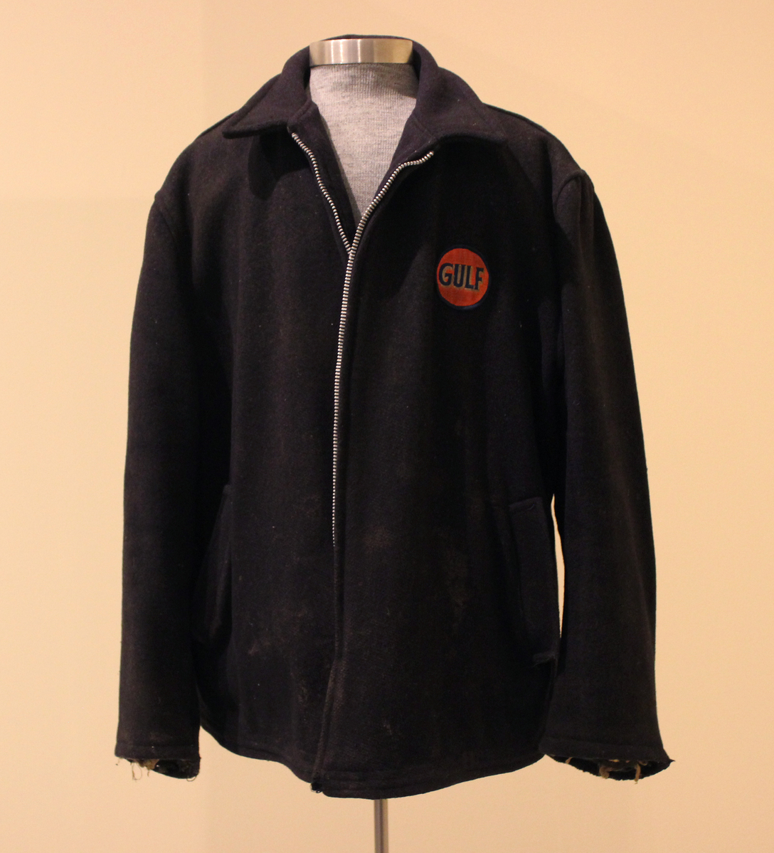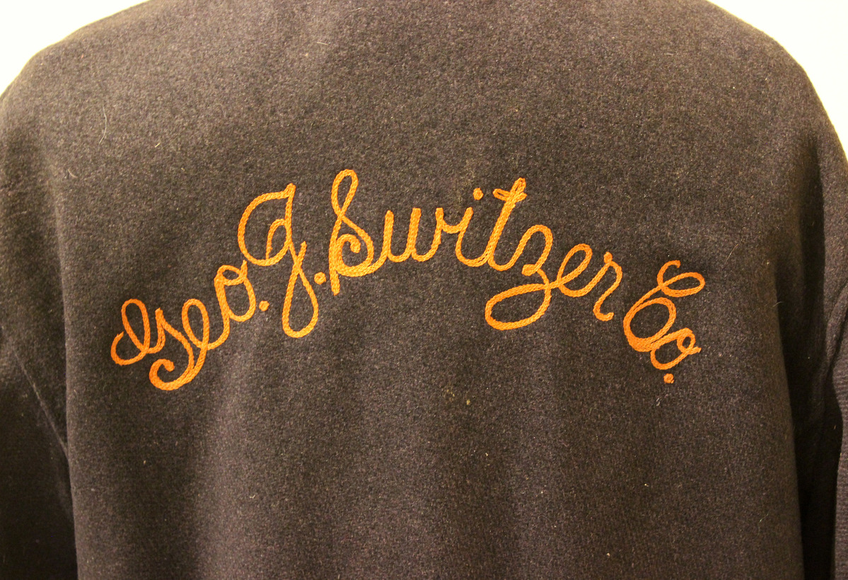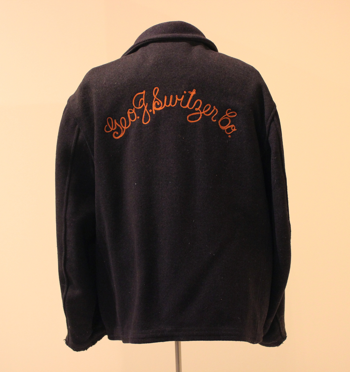 Dark navy heavy wool men's jacket. Spread collar, center-front zipper. Round orange, blue, and white embroidered patch with lettering, "GULF." Orange script embroidery on center-back, "Geo. J. Switzer Co." Tan cotton pile lining. Loop at center-back with printed label, "50." Two flap pockets on front.