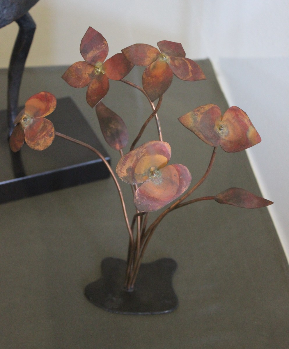 Copper wire sculpture of flowers by Asa D. Hall, a blacksmith and sculptor in East Litchfield. Seven copper wires extend from black metal base. Wires bend in different directions and terminate in either copper flowers or leaves. Sculpture has five flowers, two with four pointed petals, one with four rounded petals, one with two pointed petals, and one with two rounded petals. Marked "AH" on base with label on bottom. Label reads "MADE BY ASA D. HALL- BLACKSMITH/R. R. 3 EAST LITCHFIELD ROAD/LITCHFIELD CONN. 06759."