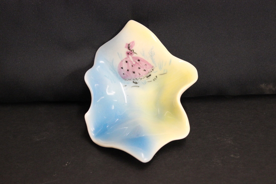Molded, leaf-shaped ashtray of cream colored porcelain. The ashtray is painted in sky blue that changes to a yellowish-green. At the top of the ashtray is painted a young girl/ woman in a pink dress with black dots and a matching bonnet (which hides her face). She stands amid tall grasses. Artist initials present at lower right.