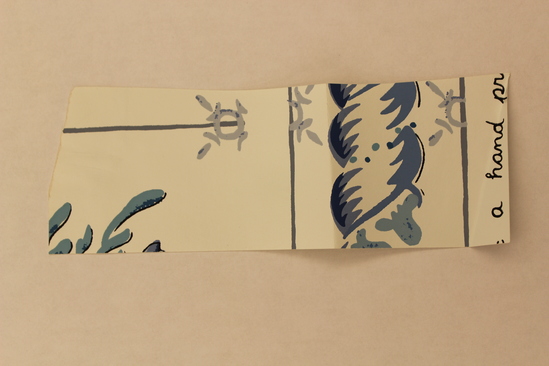 Wallpaper sample strip with white background and scallop pattern in shades of blue. There are two thin grey strips running horizontally on either side of the scallop pattern and one thing grey stripe running vertically at the top. At the bottom there is black cursive script which reads "...a hand pr..."