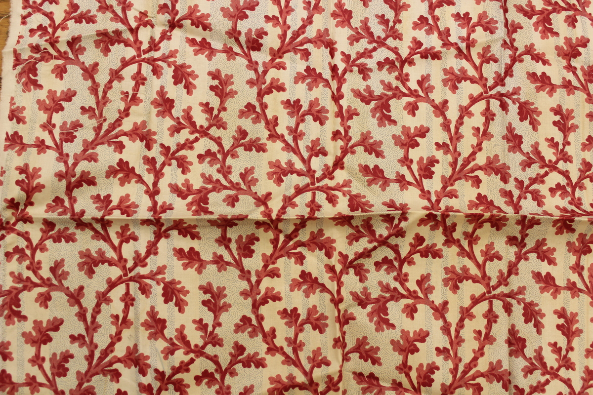 Square fabric swatch made of cotton. Background has vertical blue and white stripes of varying widths. Blue stripes are made up of small blue dots in a swirled pattern. Over the stripes is a large red leaf pattern with its branches running across the fabric. Swatch is smooth to the touch.