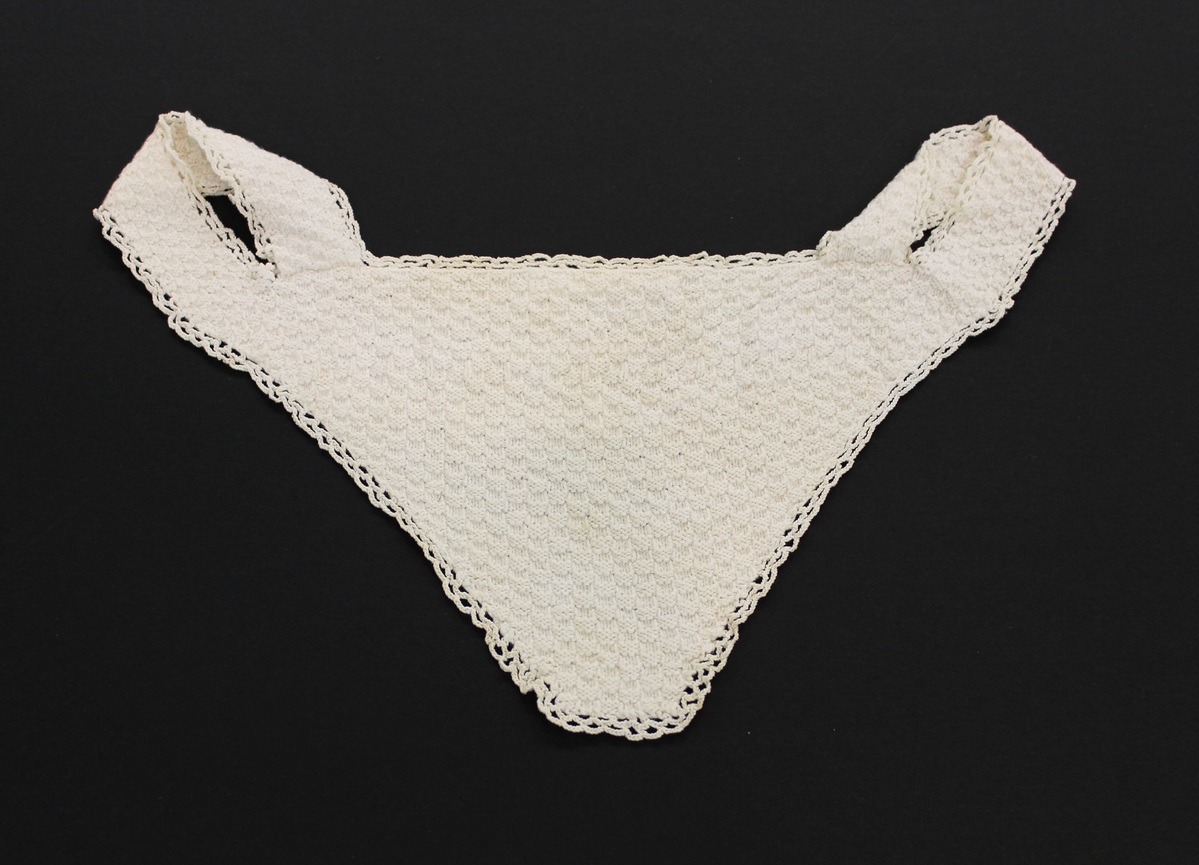 White knit cotton child's bib; straps; V at center front; crocheted lace around edges