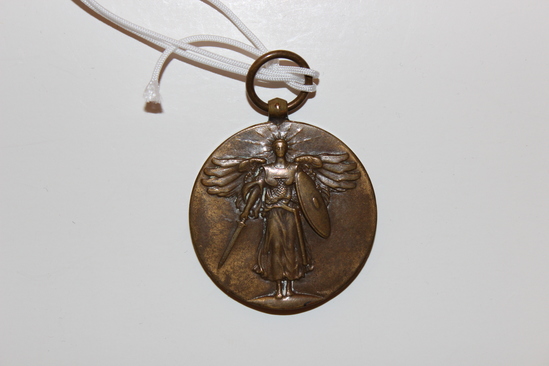 Round bronze medal. Medal decorated on one side with an image of a shield with "US" and a quill of arrows. Above is, "THE GREAT WAR FOR CIVILIZATION." To either side of the shield are listed the countries that fought Germany during WWI. On the reverse is a winged female figure holding a sword and shield. A metal ribbon loop is attached at the top.