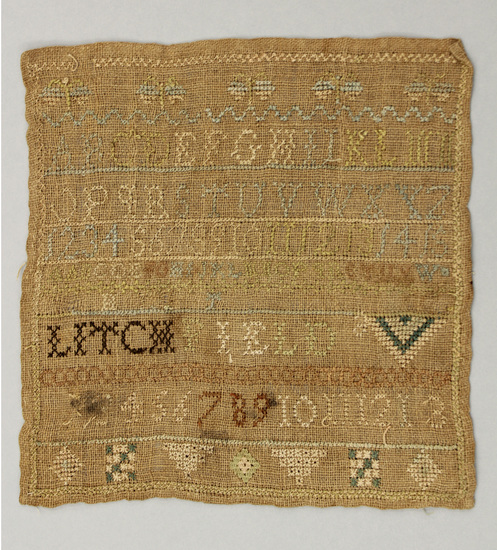Sampler executed on a loosely woven natural fiber ground. Embroidered with light blue, light green, light pink, dark brown, dark green, and copper colored thread. Sampler features a stitched light green border with five identical abstractions framing the top. The work of the sampler features capital letters in various sizes, numbers, and geometric shapes and lines. Sampler marked with the initials "BT" and "Litchfield."