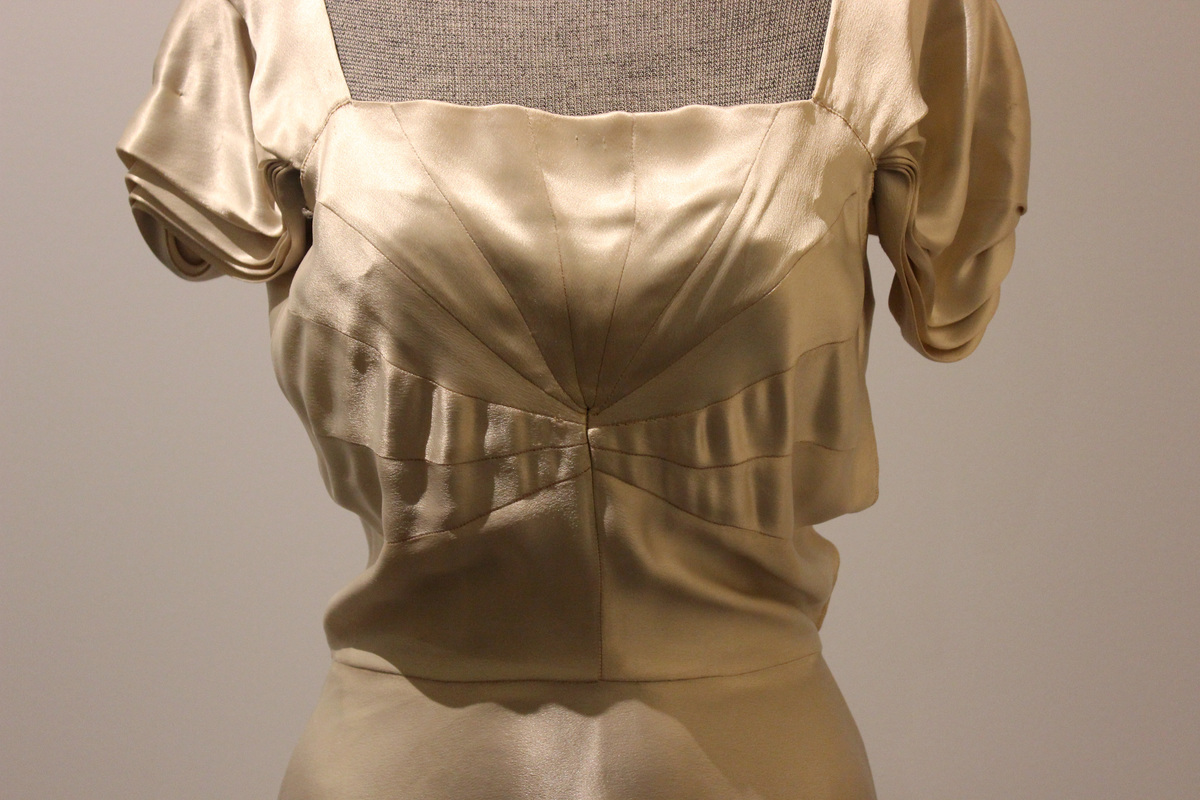 Off-white silk long dress. Fitted bodice with seams radiating from center. Draped and pleated cap sleeves. A-line skirt on the bias with rolled hem. Left side and center-back opening with hooks and eyes for closure.