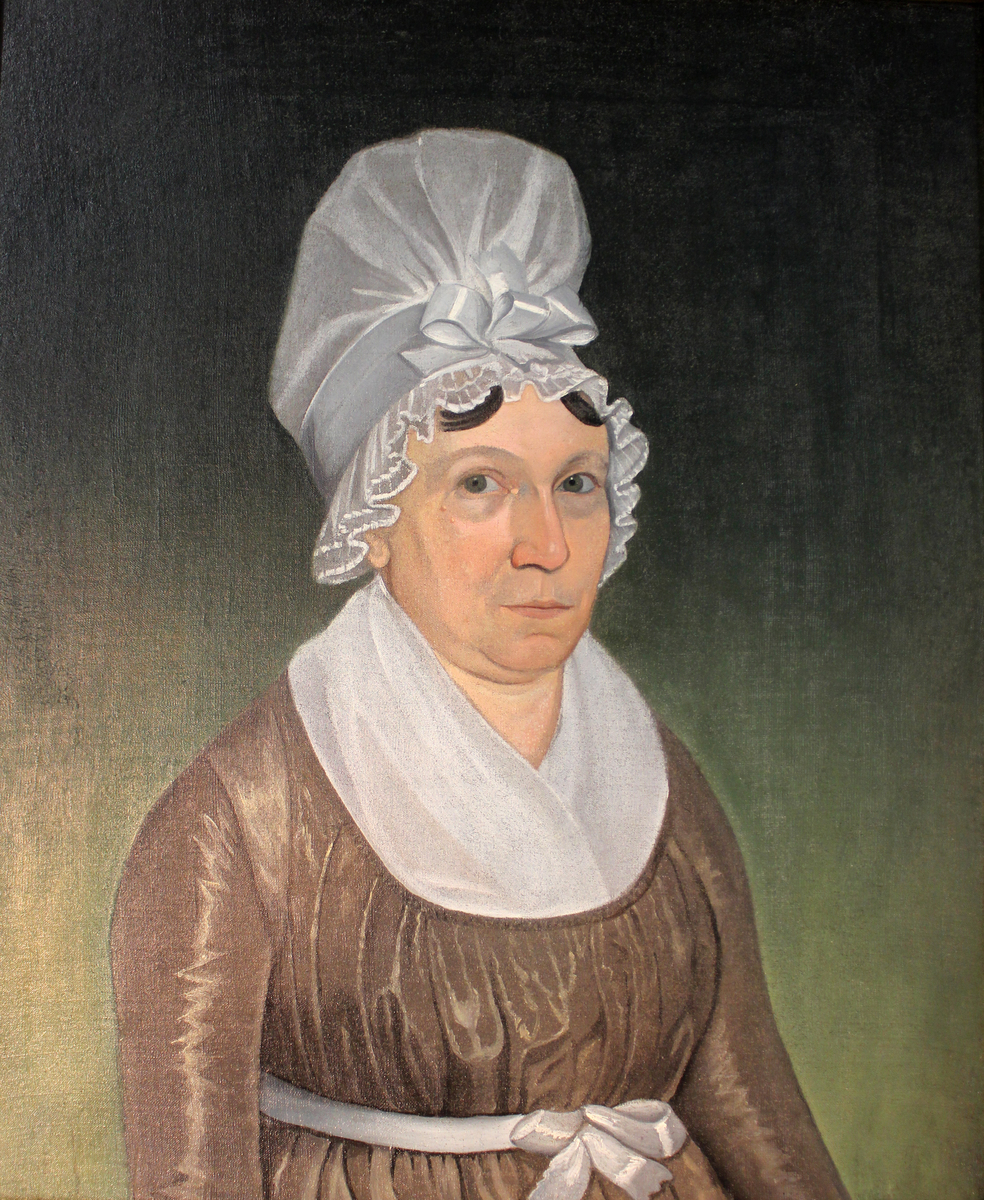Oil on canvas portrait of Ruth Hitchcock Smith. Rectangular 1/4 length portrait, sitter facing right. Middle-aged woman with dark hair, hazel eyes, and multiple birth marks on her right cheek. Wears a brown silk or taffeta dress with a white lace fichu; dress cinched at waist with narrow white silk band. Tall cap or bonnet of white silk with white ribbon and bow. Set against plain background of greens and blues. Framed in gilt wood frame with gesso decoration.