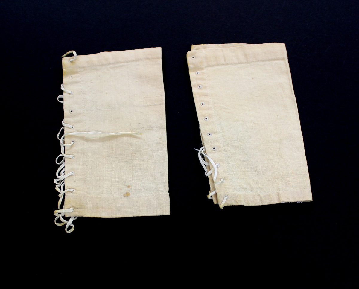 a-b: Tan cotton child's leggings; laces up back; eyelet buttonholes with cotton ties; hand-stitched