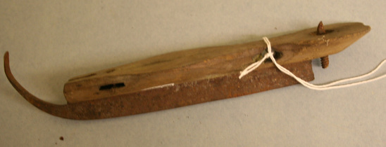 Small wooden ice skate; iron blade which curves up in a decorative fashion around the toe of the skate; iron spike protruding from heel of skate; two holes cut into side of skate where rope or leather strap could be woven to hold foot to skate